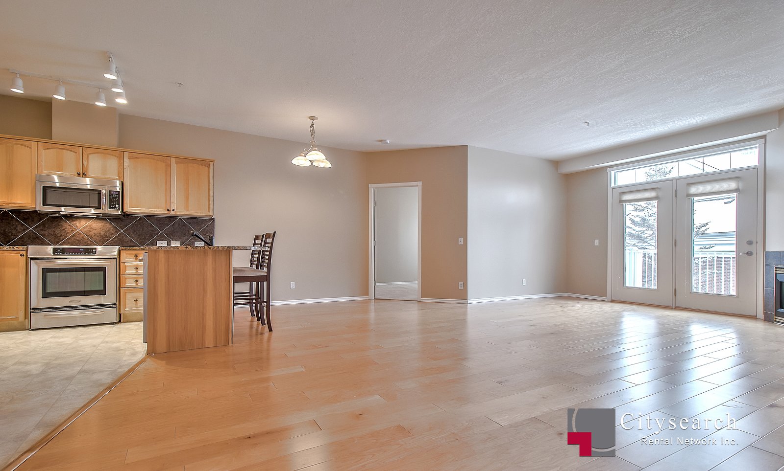 Wide open floor plan with upgraded granite countertops and stainless steel kitchen appliances: